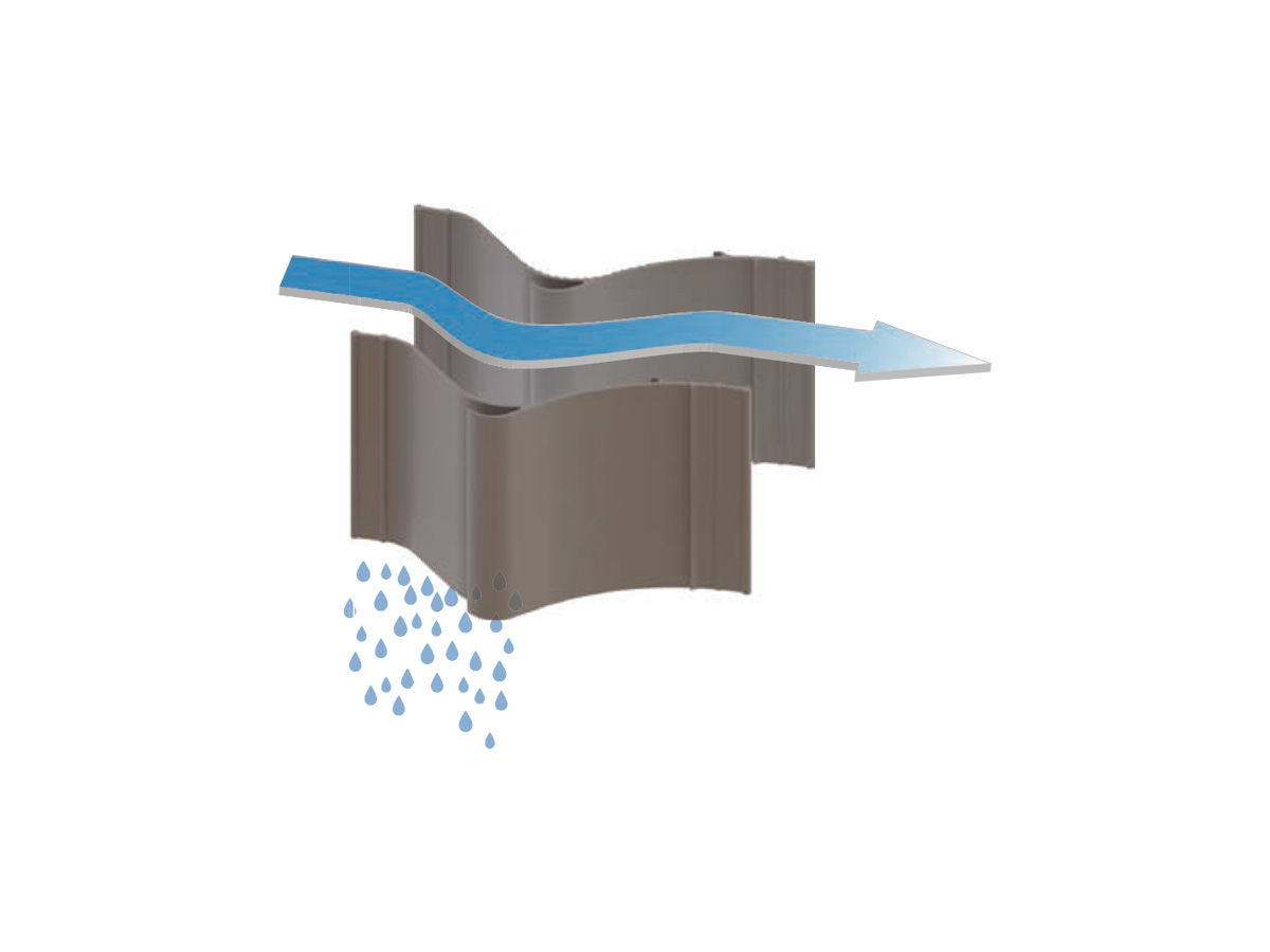 Droplet separators made of profiles/lamellas are used in processes with large air or gas flows and when the pressure drop needs to be minimised. The separation efficiency is high and the droplet separators are available for both vertical and horizontal gas flow.